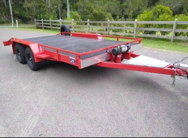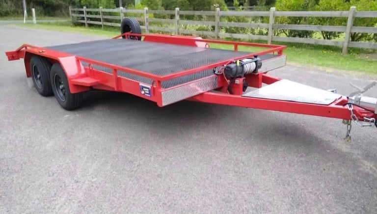 Electric winch car trailers with Bluetooth control and tie downs for secure transport.